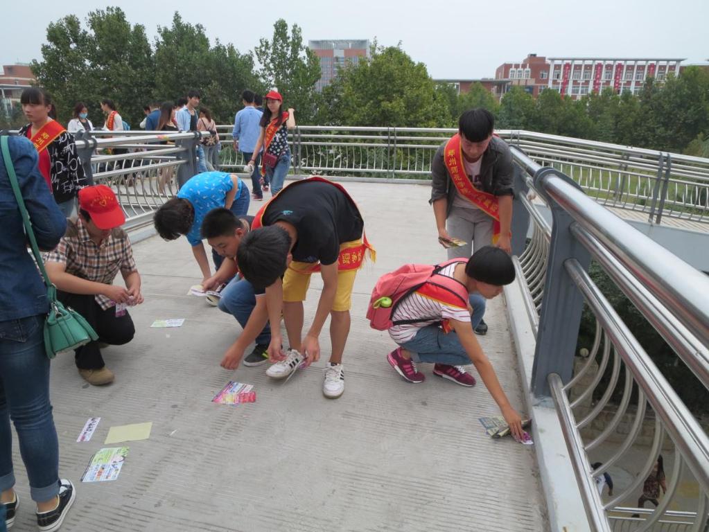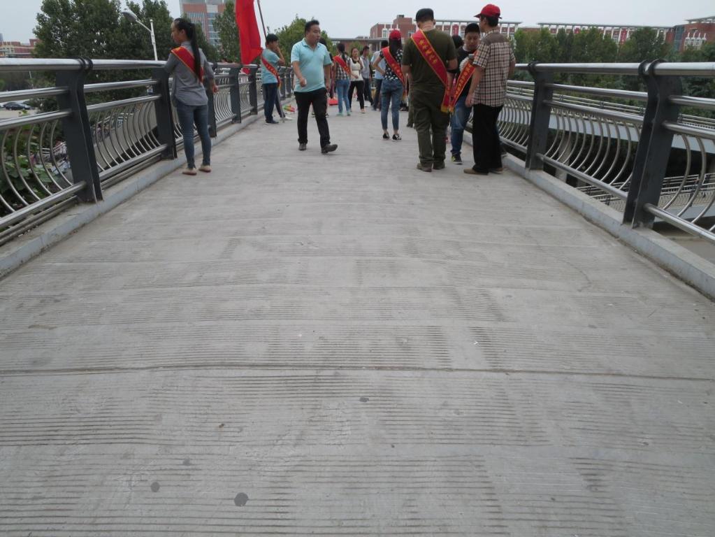 2014年9月23日下午3时音乐与舞蹈学院的青年志愿者们在英才街天桥进行“保护环境从我做起”——道德讲堂志愿服务活动。本次活动由音乐舞蹈学院文明督导员戚晓思老师组织,音乐与舞蹈学院青协分会会长王音带队准时抵达天桥。部分商家根据天桥人流量多的特点,在上面进行商业发传单的行为。一些同学看完传单习惯性随手扔在桥上,一张张的传单很快就把天桥的地面铺满了。青年志愿者们带来了打扫工具进行打扫,还有的直接用手拾捡,随后大家又拿来抹布清水把栏杆擦拭一遍,不大一会儿整个天桥整洁了许多。路过的同学不禁发出赞叹并向志愿者们道谢。最后大家留影纪念此次活动。此次活动主要想向大家宣传:不随手乱扔垃圾,保护环境从我做起,提高个人素养,增强环保意识。