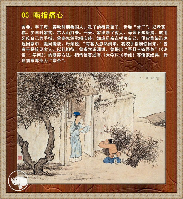 原文:周,曾参,字子舆。事母至孝。参曾采薪山中,家有客至,母无措,参不还。乃啮其指,参忽心痛,负薪以归,跪问其母,母曰:“有客忽至,吾啮指以悟汝耳”。后人系诗颂之。