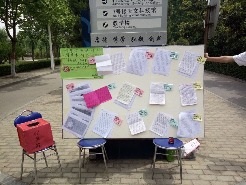 在12点之前,志愿者们就把展板、海报、桌子、投票箱等都搬到了活动现场,佩戴好绶带,等待着同学们前来参观读书成果。有的同学写的整本书的读后感;有的同学摘抄的好文、写的心得体会;还有的同学甚至把自己的读书成果制作成了PPT,一张一张打印出来,在展板上确实也夺人眼球。随着运动会闭幕式结束,一大波同学从操场涌出,看到我们的展板,都纷纷过来询问,我们的志愿者也积极向同学们介绍我们四月读书月的活动。同学们翻看展板上的读书成果,并写下了自己喜爱的读书成果的序号,投入投票箱,参与投票。现场投票就在同学们积极参与,热情讨论的氛围中落下了帷幕。5月16日至5月18日,即下周一至周三,读书成果将会在信科院团学之家官方微信上进行展示,欢迎各位同学查查看读书成果并为喜欢的读书成果投票,