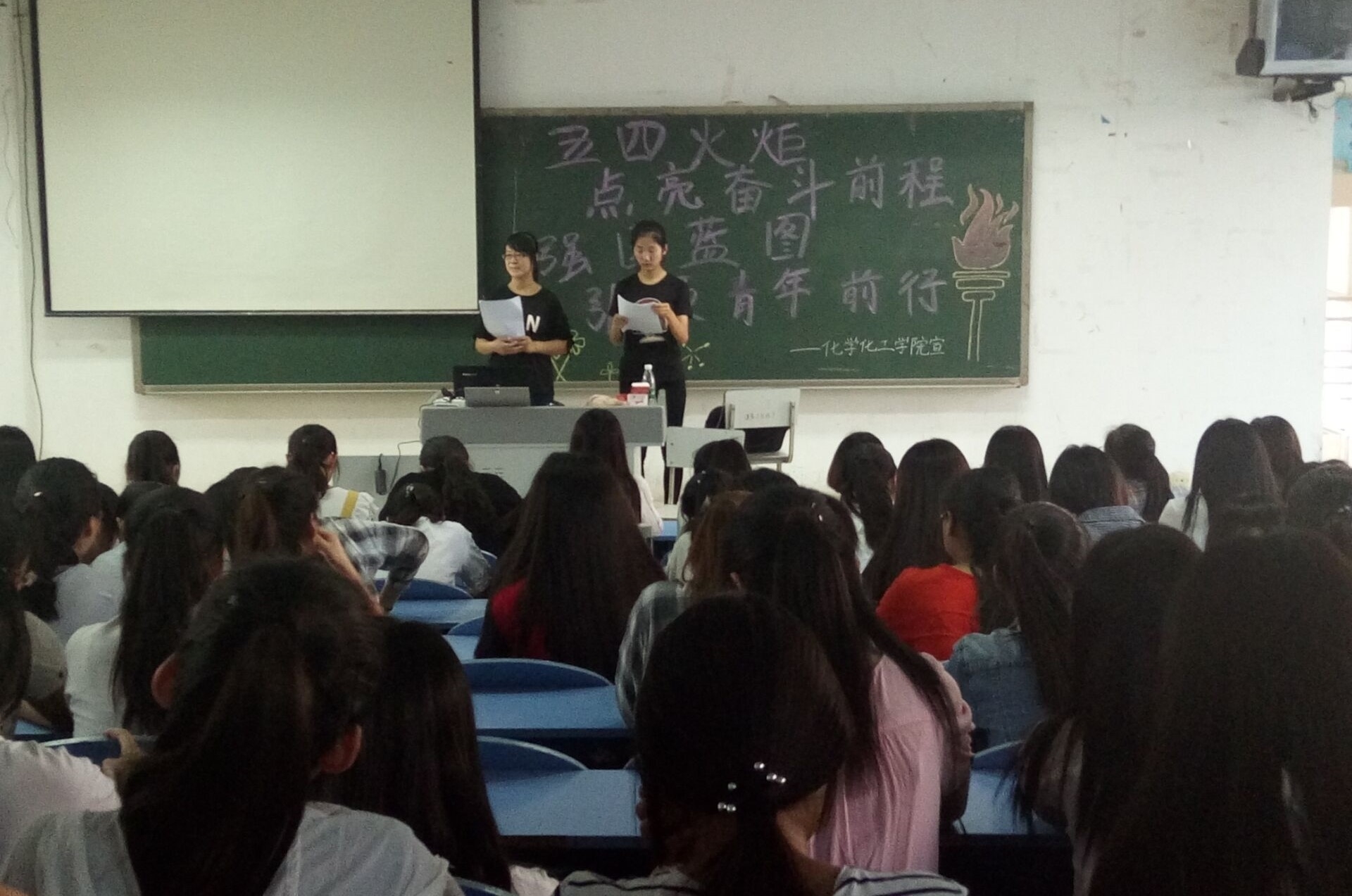 为了增强同学们的爱国意识,化学化工学院于2017年05月16日下午6点在西校区如期开展以“五四火炬,点亮奋斗前程;强国蓝图,引领青年前行”为主题的政治学习。由16化学二班团支书刘亚雯主讲,16级全体学生参与。