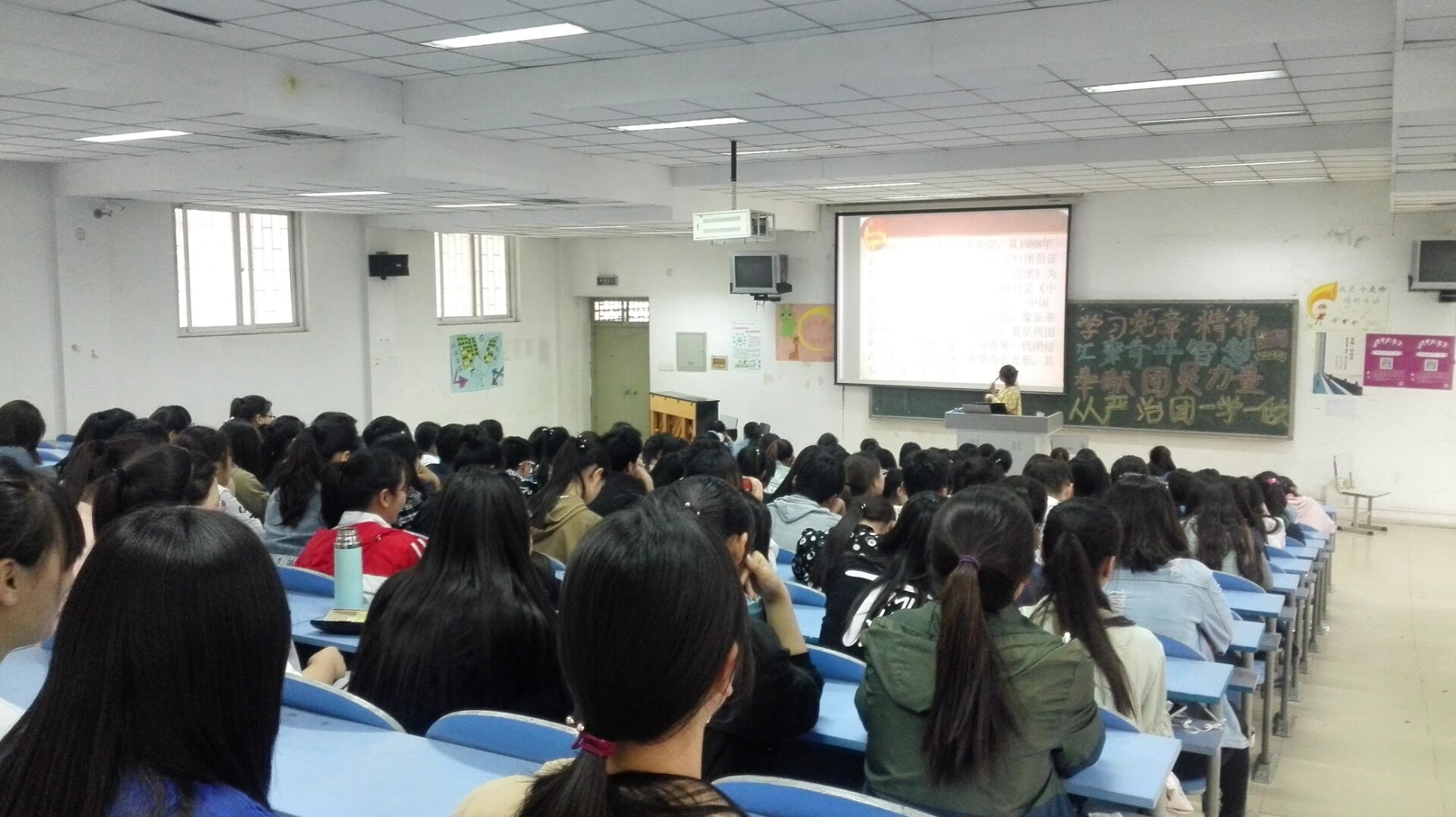 2017年4月26日下午6点教育科学学院于西校区一阶二教室开展了以“学习党章精神,汇聚青年智慧,奉献团员力量”为主题的政治学习会议,从而加强从严治团一学一做精神。本次会议由B16专升本班耿佳宝主持,16级全体学生前来参加本次会议。