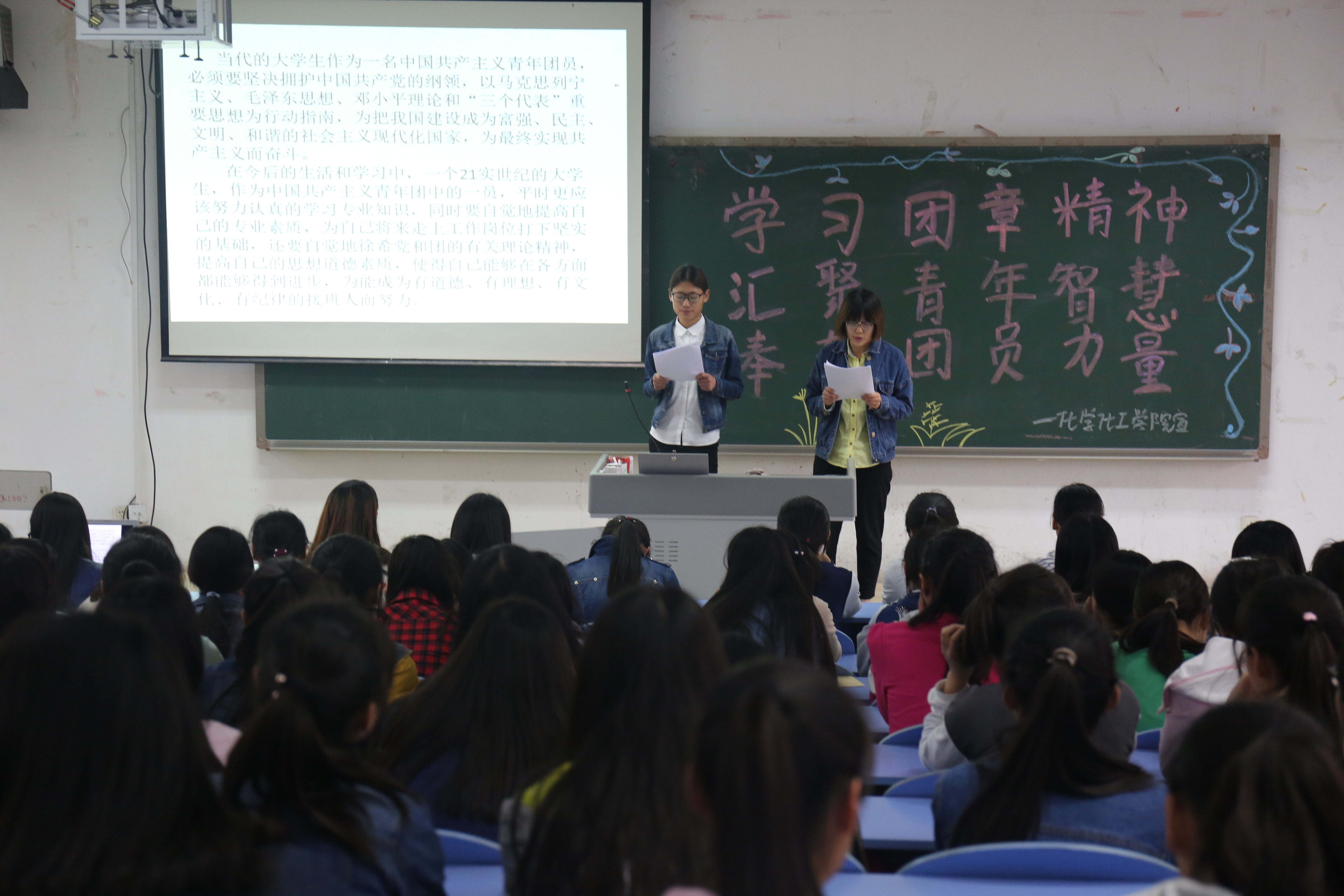 为了增强同学们对共青团的认识,化学化工学院于2016年4月25日下午六点在西校区四阶二如期开展主题为“学习团章精神 汇聚青年智慧 奉献团员力量”的政治学习。此次政治学习由16级化学一班团支书孙雪茹主讲,16级全体同学参与。