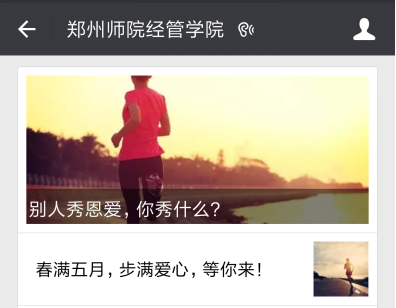 经济与管理学院也据此策划开展了“春满五月·布满爱心”的QQ健康微公益活动,鼓励同学们在健康运动的同时,献出自己的爱心。自此,运动的意义,不再仅仅是占领微信、QQ运动的封面,或改变朋友圈排行榜的名次,更有可能影响他人生活的幸福指数。一日益行,为山区的孩子增添一抹色彩,用爱打造他们的多彩天地。路走多了,心变近了。同时,也希望借此能轻抚同学们长期上网的疲惫之意,为同学们树立起一种良好风尚。
