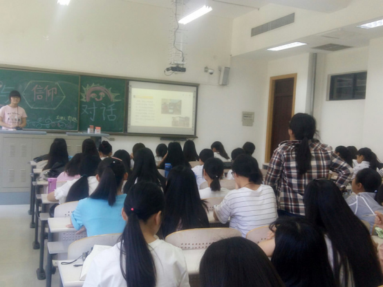 2016年5月24日郑州师范学院外国语学院B15级全体同学分别在综合楼A102、A105、C117召开“与信仰对话”为主题的团课活动。
