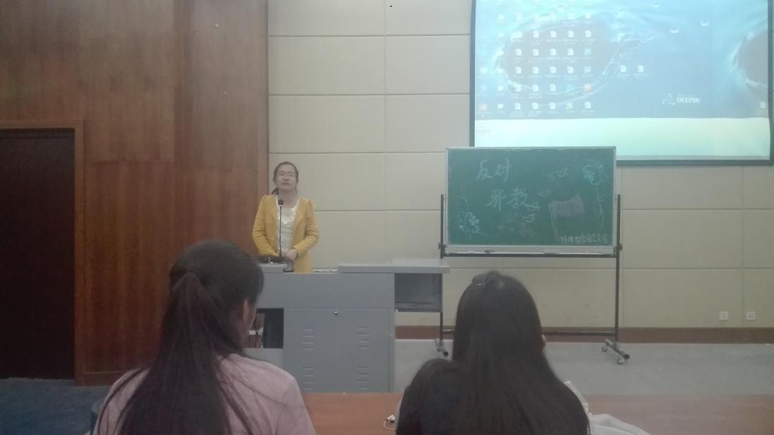 邪教”以歪理邪说蛊惑人心,扰乱正常秩序,破坏社会稳定。为了加强大学生对邪教的认识,郑州师范学院特殊教育学院于2016年4月19日在特教楼312举办了以“反邪教”为主题的知识讲座,让学生通过知识讲解了解“什么是邪教”、“在生活中如何保护自己”等问题,让我们的大学生切实认识到邪教的危害,防止邪教的封建、愚昧毒害青年一代。