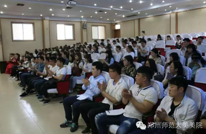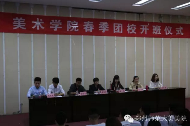 为了提高团学干部的思想政治素质和业务能力,全面提高团学干部组织能力和管理水平,加强我院团学工作的凝聚力和影响力。2016年4月14号,郑州师范学院美术学院于西校区一号楼二楼学术报告厅举办了"美术学院春季团校开班仪式"。 校团委崔璨老师,美术学院党总支周俊芳书记,美术学院团总支王滢书记,美术学院张旭飞老师与美术学院张雯老师出席了此次仪式。美术学院全体干部参加了开课仪式。
