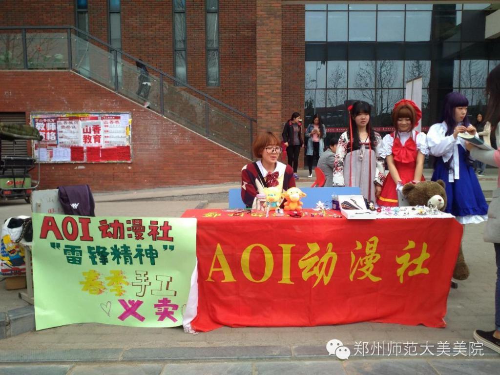 今天是2015年3月22日星期二,AOI动漫社于上午十一点半在郑州师范学院东校区食堂门口举行了“雷锋精神”春季义卖活动。