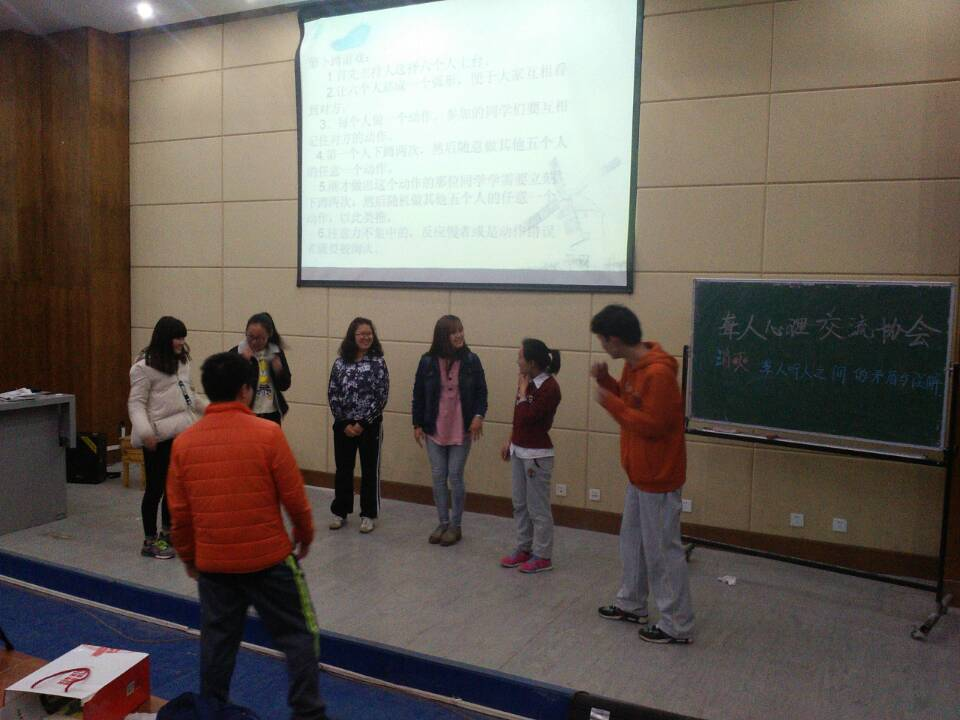 本次交流活动由特殊教育学院聋人心理交流协会发起,参与人员包括协会全体成员及10名聋生,“动作接龙”、“萝卜蹲”、“站报纸游戏”三个游戏环节带动现场气氛,逐渐消除了聋生与协会会员之间的隔离感,两个情景剧的上演更是将现场气氛推向了高潮,面对听人的质疑,聋生一句“除了听,什么都能做!”引发全场热烈掌声。