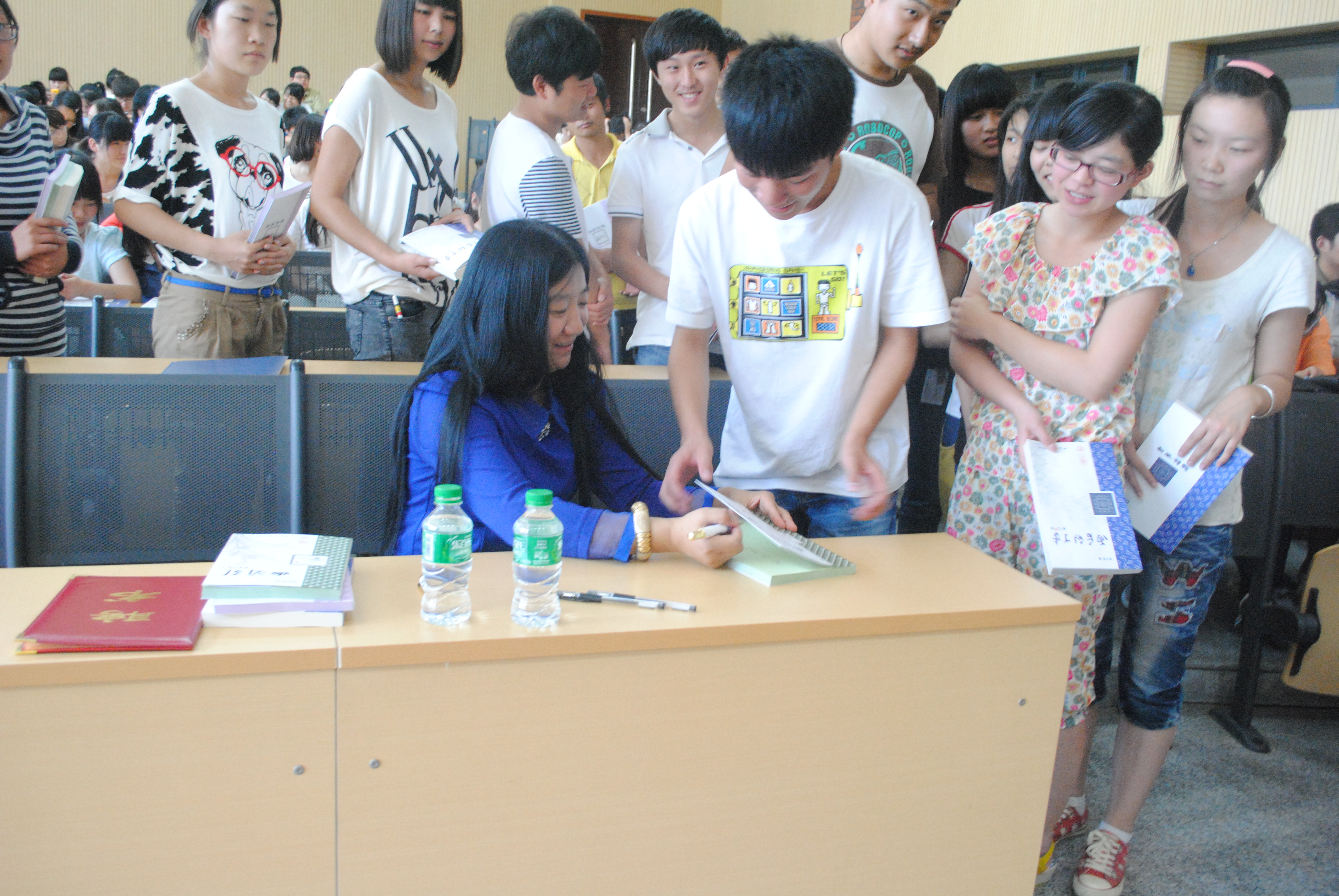 活动开始,副校长张建航为谢向英女士颁发了兼职教授聘书。谢向英女士现场为同学们签名售书,并为我校学生送上学业祝福。她希望,同学们要珍惜现在的学习环境,在生活、学习中要秉承“工作着、生活着、快乐着“三个原则;要张扬自身个性,对自己的目标执着追求。谢老师还与同学们进行了互动,并送上箴言警语,活动在轻松愉悦的气氛中结束。