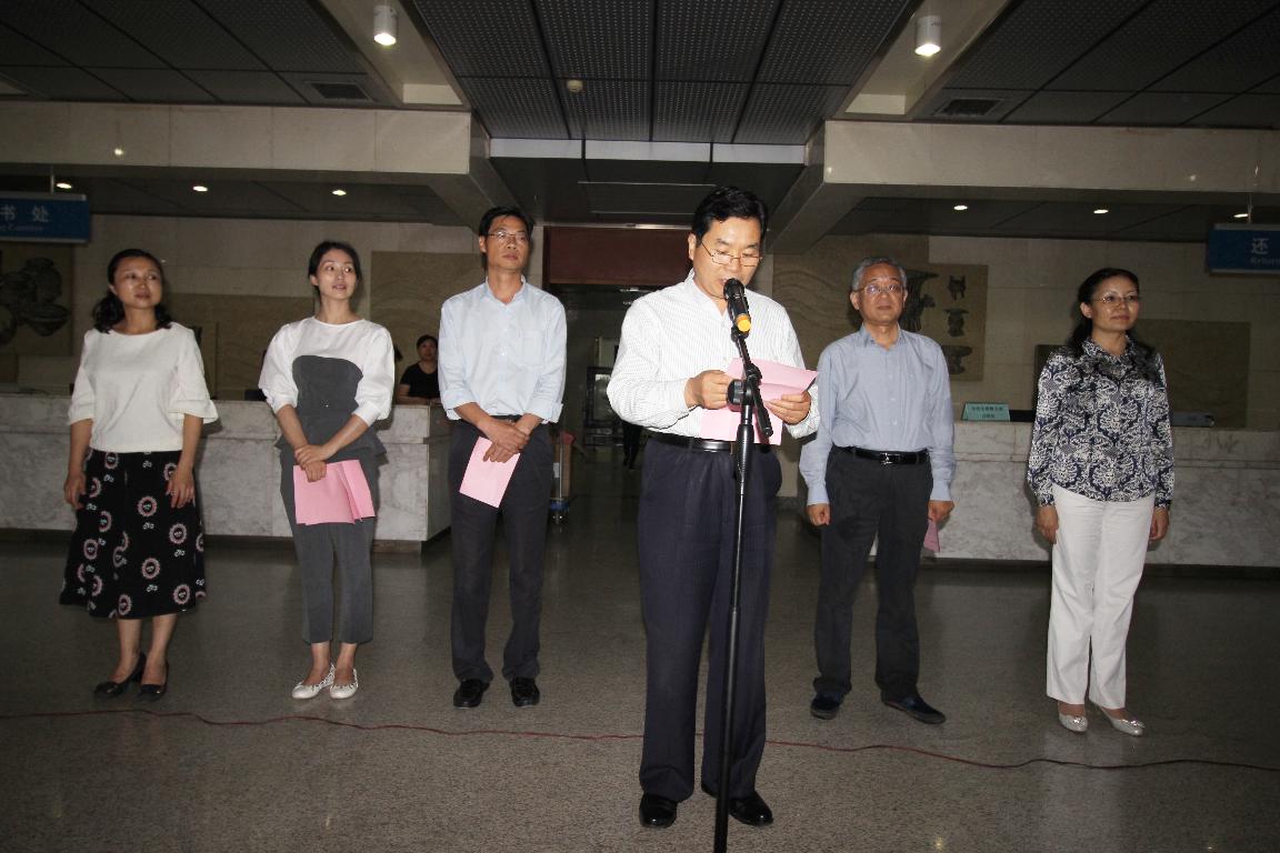接下来是领导嘉宾宣读获奖名单,校党委宣传部部长惠保德宣读文明馆员和服务标兵名单,学生处处长杨朝红宣读优秀学生馆员名单,校团委书记王珊宣读读书标兵名单;学生赵豫、谭晓分别代表优秀学生馆员和读书标兵发言。