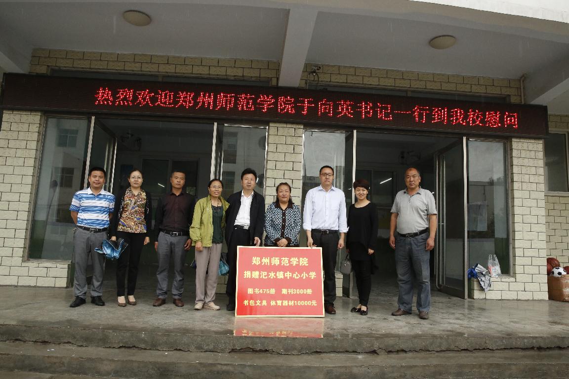于书记一行来到汜水镇中心小学,仔细察看了学校的教室、活动场所等硬件设施情况,详细了解了学校的办学历史、办学条件、师资力量等情况。于书记代表学校为中心小学捐赠图书475册,期刊3000册,价值10000元的书包、文具及体育器材。于书记在讲话中指出,“六一”国际儿童节就要到了,祝孩子们节日快乐,健康成长。她勉励学生们要认真学习、刻苦钻研,自觉养成良好品德和行为习惯,长大后做一个对社会有用的栋梁之才。新沟村是我校的定点扶贫村。为落实中央、省委精准扶贫要求,各党总支、处室要高度重视结对帮扶工作,真正做到思想认识到位、组织落实到位。要充分利用我校现有资源,动员社会力量,开展产业扶贫、教育扶贫、文化扶贫等,确保2016年底新沟村完成脱贫任务。