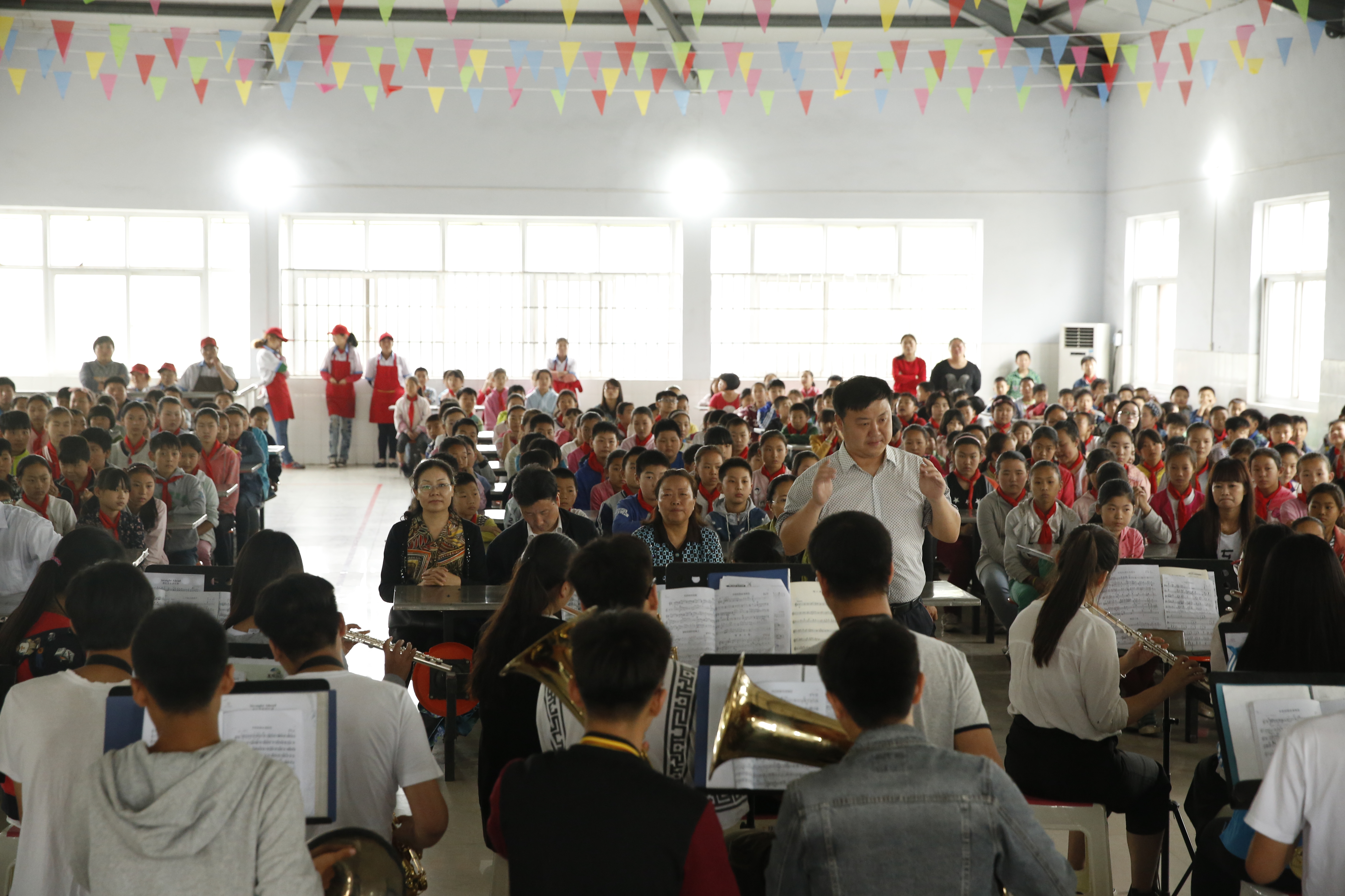 在小学的礼堂,我校初等教育学院大学生管乐队为孩子们带来了一场别开生面的演奏表演,普及了音乐知识。听着熟悉的旋律,孩子们齐声合唱,大学生带领着小学生们一起度过了一个特别的节日。