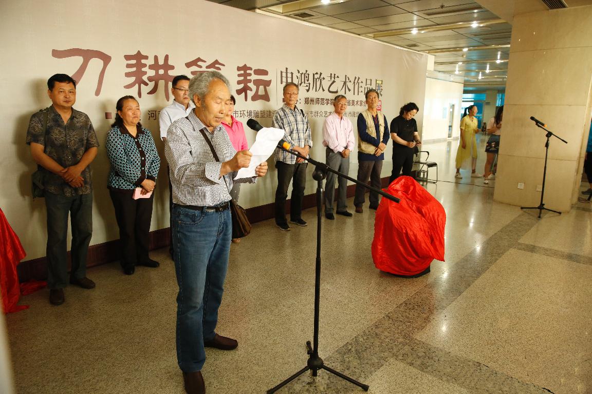 5月22日上午,“刀耕笔耘—申鸿欣艺术作品展”在西校区图书馆开幕,河南省美术家协会主席刘杰,河南省美协雕塑艺委会会长崔国琦,我校党委书记于向英出席开幕式。开幕式上,申鸿欣老师向学校捐赠了他潜心创作的书画、雕塑等艺术作品。