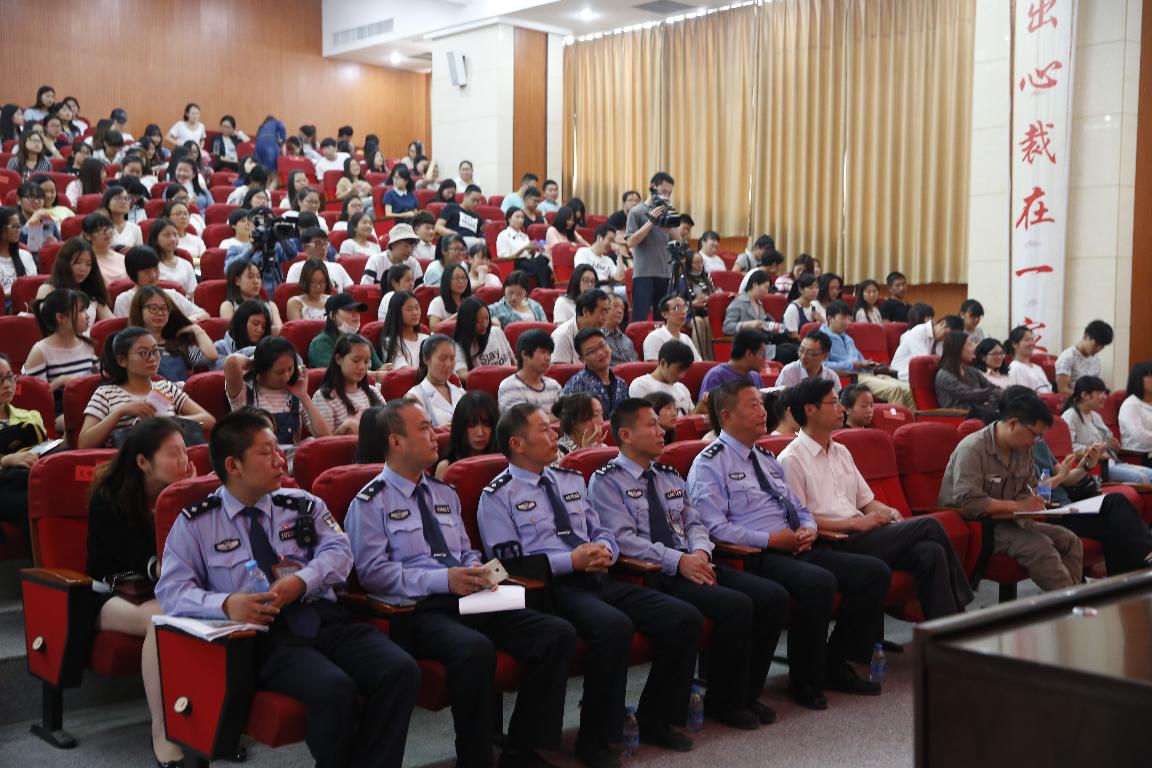 接着交警五大队教导员程潜、民警贾华东、全国公安机关爱民模范杨华民三位同志走分别上讲台,用质朴的语言和真实的感情,用自己的亲身经历,用身边战友的故事讲述了他们在平凡的工作岗位上创造的奇迹、直至用生命来保障交通畅通和行人安全的感人事迹;讲述了广大民警在大家与小家之间的艰难取舍中、在交通执法中被执法对象误解中,毅然选择责任与坚守。正如杨华民警官在谈到自己的工作时所说:“冬迎风霜,夏顶热日,累并快乐着。”他们在工作中没有惊天动地光辉业绩,他们用艰苦的工作、用生命保证了省会郑州交通的畅通,保护着我们每一个交通参与者的安全,炎炎烈日下,他们标准规范的指挥手势,挥汗如雨的忙碌身姿,成为我们这个城市一道亮丽的风景线。宣讲现场气氛热烈,师生们一次次用热情的掌声和欢呼声向交警同志表达自己的敬意。