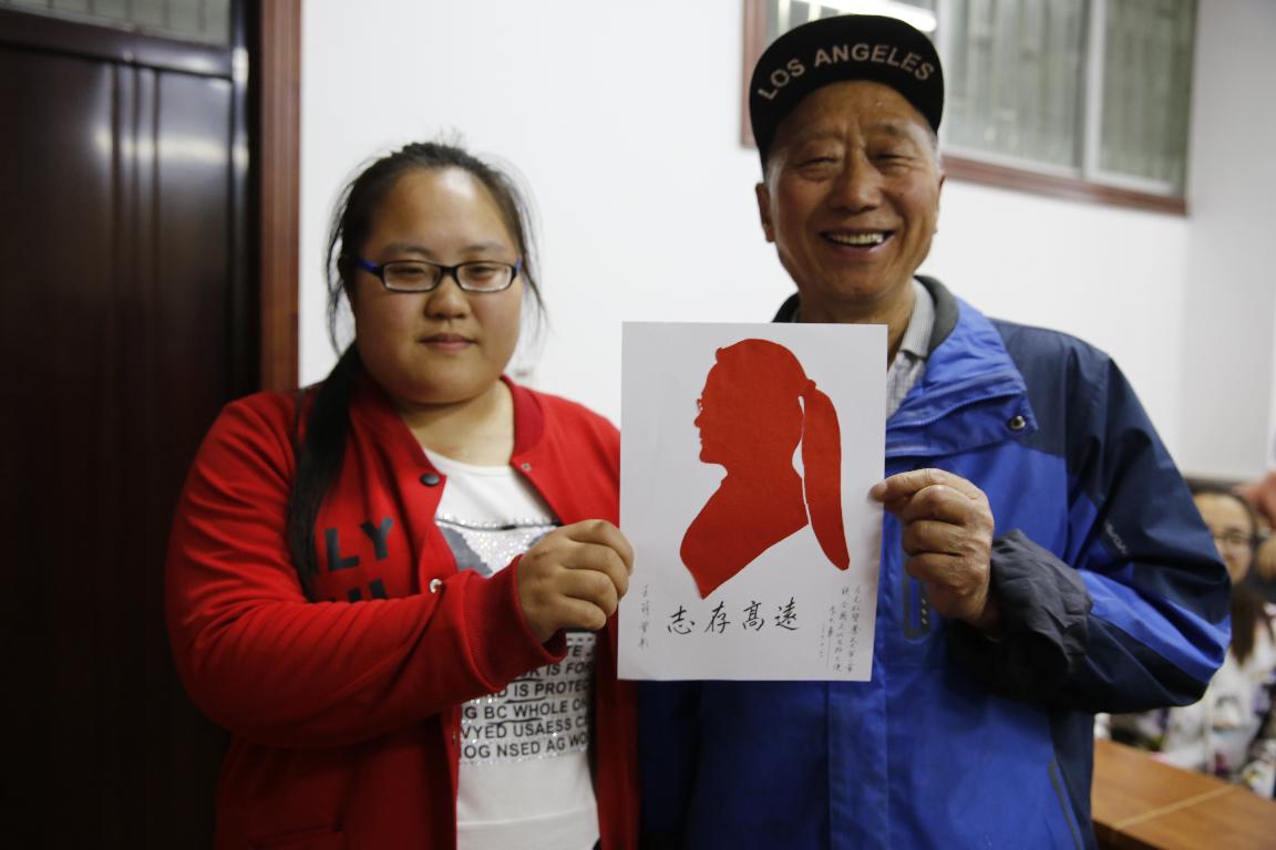 一把剪刀,一张红纸,一段剪影人生,不愧是对李天华人生的真切描述。他的现场剪影赢得了同学们热烈的欢呼和经久不息的掌声。只见他拿出一把剪刀,一张红纸,请一位同学上台,仔细端详同学的面容后,舞动剪刀,扭转红纸。剪刀便在红纸间来回穿梭,咔嚓几下,一副逼真的人像剪影出现在大师手中,而用时竟然还不到三分钟。同学们叹为观止。接着他小心翼翼地将剪影贴在白纸上,并题“志存高远”四个飘逸的大字赠予同学作为纪念。“用剪刀代替画笔,把剪影视为绘画,这就是剪影。”他还语重心长地说,“人要有梦想,要下定决心去学习一门技能并坚持到底,这样会受益终生。”他表示剪影就是他的梦想,他此生用实际行动来传承传统文化。