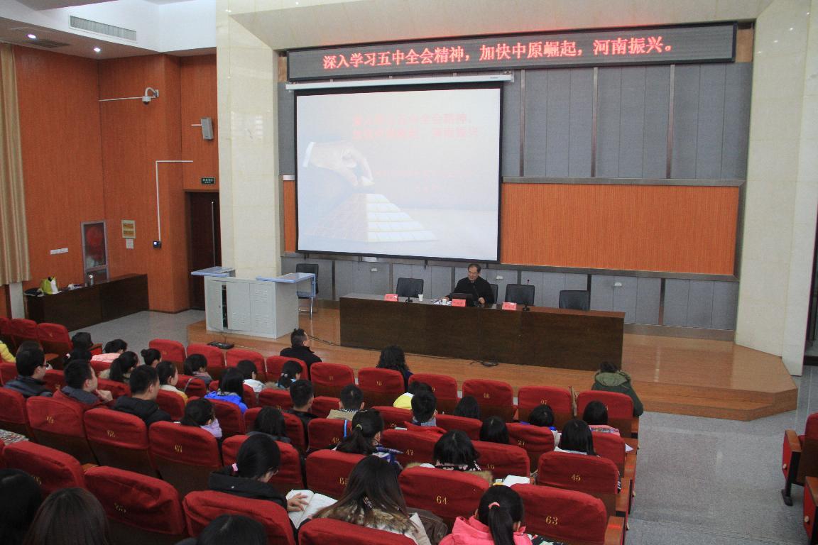 王教授重点对“十三五”时期经济社会发展的背景、理念、目标、原则、方向、举措、机遇、挑战等多个方面进行深刻的理论阐述和独特的专业解读,借用大量生动形象的实例进行数据对比、综合分析,深入浅出的剖析了“十二五”以来党中央治国理政新成就新经验、“十三五”时期面临的新形势、新任务、新挑战以及“五中全会精神”对今后河南省经济发展的影响。讲座观点深刻、内容丰富、语言风趣幽默,获得在场师生的阵阵掌声。