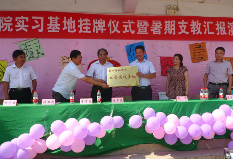 挂牌仪式上,张双利局长代表荥阳市教体局表达了对此次挂牌仪式的高度重视,对郑州师范学院初等教育学院参加暑期支教的师生表示感谢,并希望此项合作能长期开展下去。初等教育学院陈冬花院长介绍了我校小学教育专业的办学历史和发展现状,并对以服务河南省农村基础教育为目的的“河南省卓越小学教师培养计划”进行了说明。翟幸福副书记代表郑州师范学院为高村乡第一小学进行教育实习基地和暑期社会实践基地授牌。