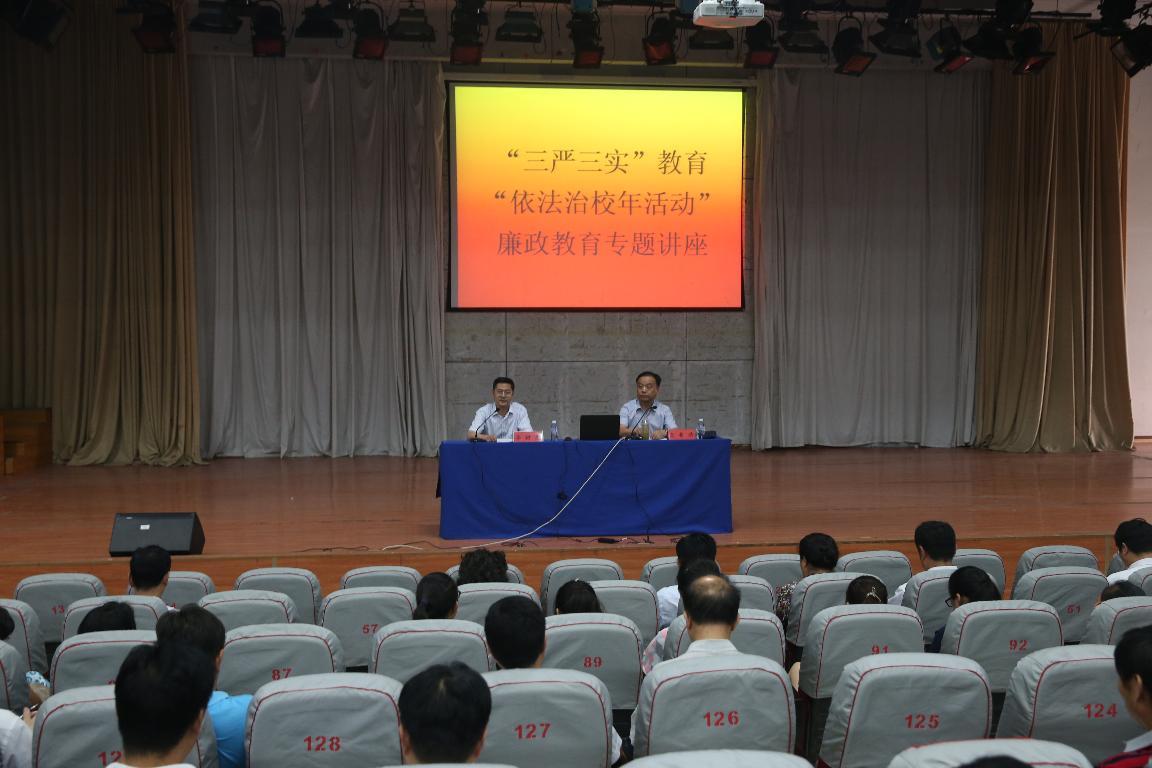 根据校党委工作安排,为全面落实党的十八届四中全会、中纪委五次全会和习近平总书记系列讲话精神,深化“四风”整治,认真开展“三严三实”主题教育及省教育厅“依法治教年”活动,5月9日我校邀请郑州市纪委常委、秘书长高希浩同志为我校副科级以上干部做了《反腐败形势与任务》专题报告。