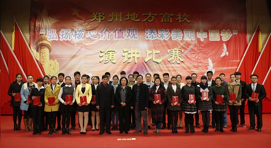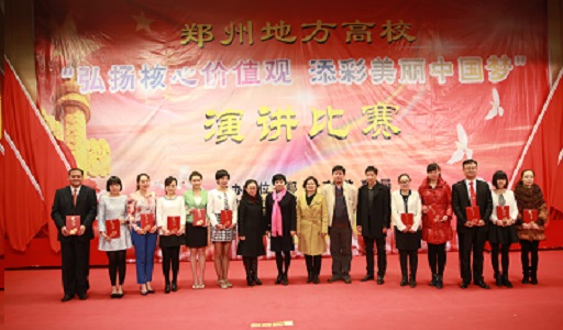 为深入贯彻落实党的十八大、十八届三中全会、十八届四中全会精神和习近平总书记系列重要讲话精神,特别是习近平总书记今年“五四讲话”重要精神,促使青年师生深刻认识大力弘扬社会主义核心价值观、努力实现中华民族伟大复兴梦的重大意义,11月27日,由市教育局主办,郑州职业技术学院、郑州电视台承办的“弘扬核心价值观,添彩美丽中国梦”演讲比赛在郑州职业技术学院隆重举行。来自全市教育系统的16名教师代表和31名学生代表参加了本次比赛,我校也派出选手参加比赛,并荣获佳绩。
