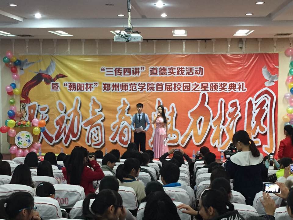 为了表彰先进个人,树立当代大学生的形象与榜样,11月19日下午,由校共青团委员会主办,美术学院团总支、美术学院社团联合会承办的“三传四讲”道德实践活动暨“朝阳杯”郑州师范学院首届校园之星颁奖典礼在西校区一号楼报告厅举行。校团委、校社团、美术学院、文明办以及各学院团总支负责人、各学院学生代表二百余人参加了此次颁奖典礼。 一支活力动感的开场舞为典礼拉开了帷幕。本届校园之星的评选经过了老师和同学们的共同投票,共揭晓了十名校园之星和一个优秀团队,由各院团总支书记为获奖同学颁发了奖杯和证书。接着也公布了本届校园之星的提名奖,并对他们表示鼓励。最后典礼在一曲充满感动与温馨的《相亲相爱》中落下帷幕。 此次校园之星的颁奖典礼,启迪和激励了每一位学生,展现了我校优秀大学生的魅力风采,同时也营造了更加积极向上和催人奋进的校园氛围。 |