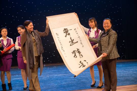 10月30日晚,由河南省文化厅主办、郑州师范学院承办的“美国落基山芭蕾舞团河南巡演”活动在我校举行。观看本次演出的领导有我校党委书记于向英,党委副书记张进峰,副校长蒋丽珠,副校长张建航,副校长贾敏仁,及群众教育路线督导组领导。演出结束后,于书记向美国落基山芭蕾舞团赠送了书法作品,对演出成功表示祝贺。