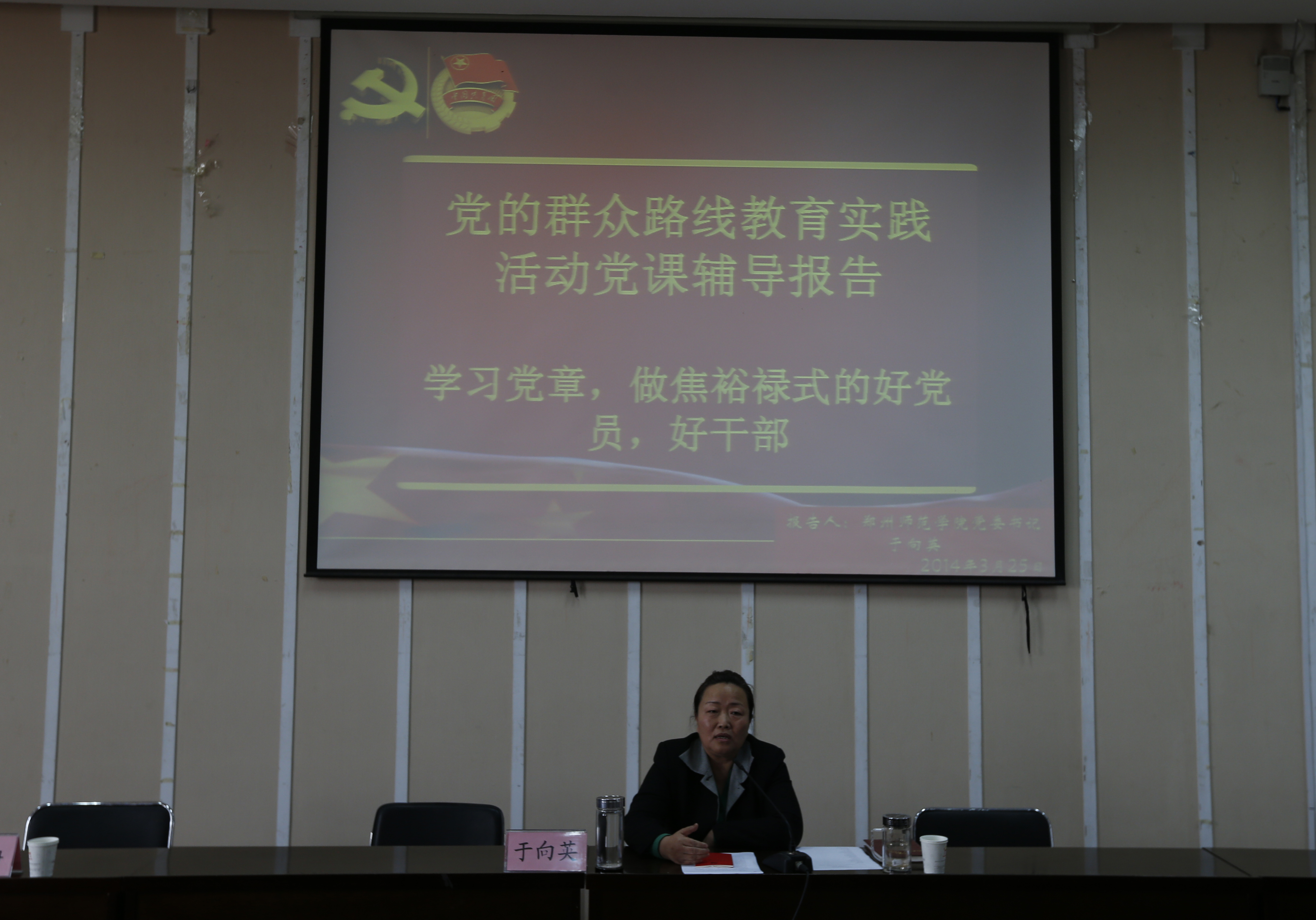 为了鼓励当代大学生树立科学的理想信念,加强思想道德建设。校党委书记于向英于3月25日下午,在西校区一号楼201多功能报告厅内开展了“党的群众路线教育实践活动党课辅导报告”,校团委、各院系团总支书记以及学生代表参加报告会。省委第二十督导组联络员、省教育厅机关党委副书记闫治国同志到会督导。