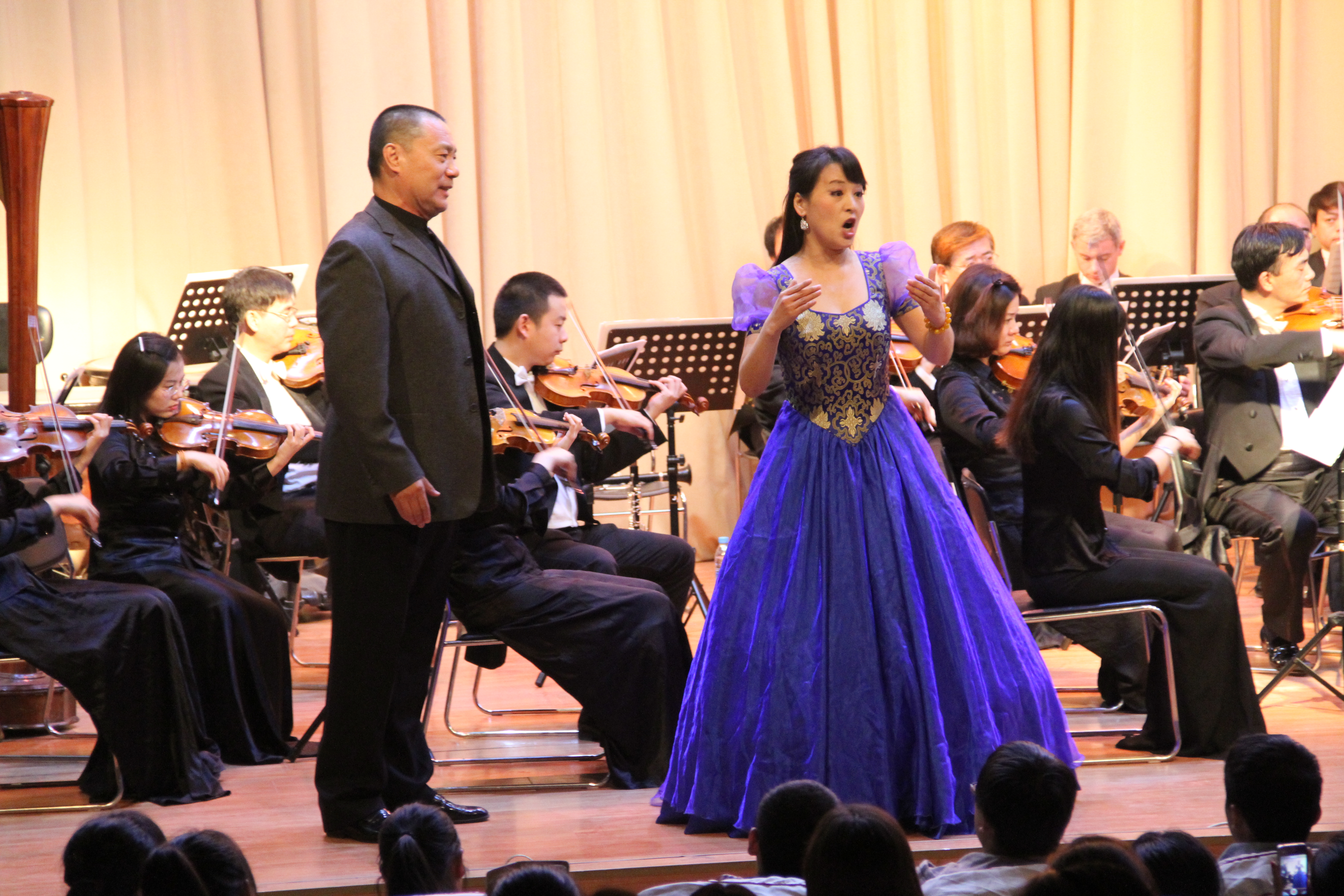 在歌剧《卡门》的乐曲声中,本次演出拉开帷幕。中央歌剧院的艺术家王红、耿哲、王立民、向子文等人分别以独唱、二重唱、四重唱等多种演唱形式,运用法语、意大利语等多种语言精彩地演唱了《卡门》、《弄臣》、《图兰朵》等世界经典歌剧选段。著名女高音歌唱家王红演唱的卡门的咏叹调“爱情像一只自由鸟”仿佛把现场的人们带进了一个自由翱翔的世界;著名歌唱家高蕾、牛莎莎、孙雪曼、耿哲、吴彦彧、阮余群表演的歌剧《霍夫曼的故事》选曲二重唱“船歌”、费加罗的咏叹调“再不要去做情郎”、歌剧《詹尼斯基奇》选曲劳蕾塔的咏叹调“我亲爱的爸爸”以其优美的旋律、动听的歌声、独特的剧情以及丰富多彩的演奏方式深深打动了在场的每一位观众,使人陶醉其中,不能自已。现场掌声雷动,一次次将现场的气氛推向高潮。在整场演出过程中,中央歌剧院的艺术家们还与我校学生互动,默契配合,共同完成《茶花女》的歌剧场景演出。演出最后,艺术家们唱起了耳熟能详的《饮酒歌》、《拉德斯基进行曲》,全体观众以热烈的掌声随着音乐打起节拍,表达对艺术家们的敬佩及感谢。
