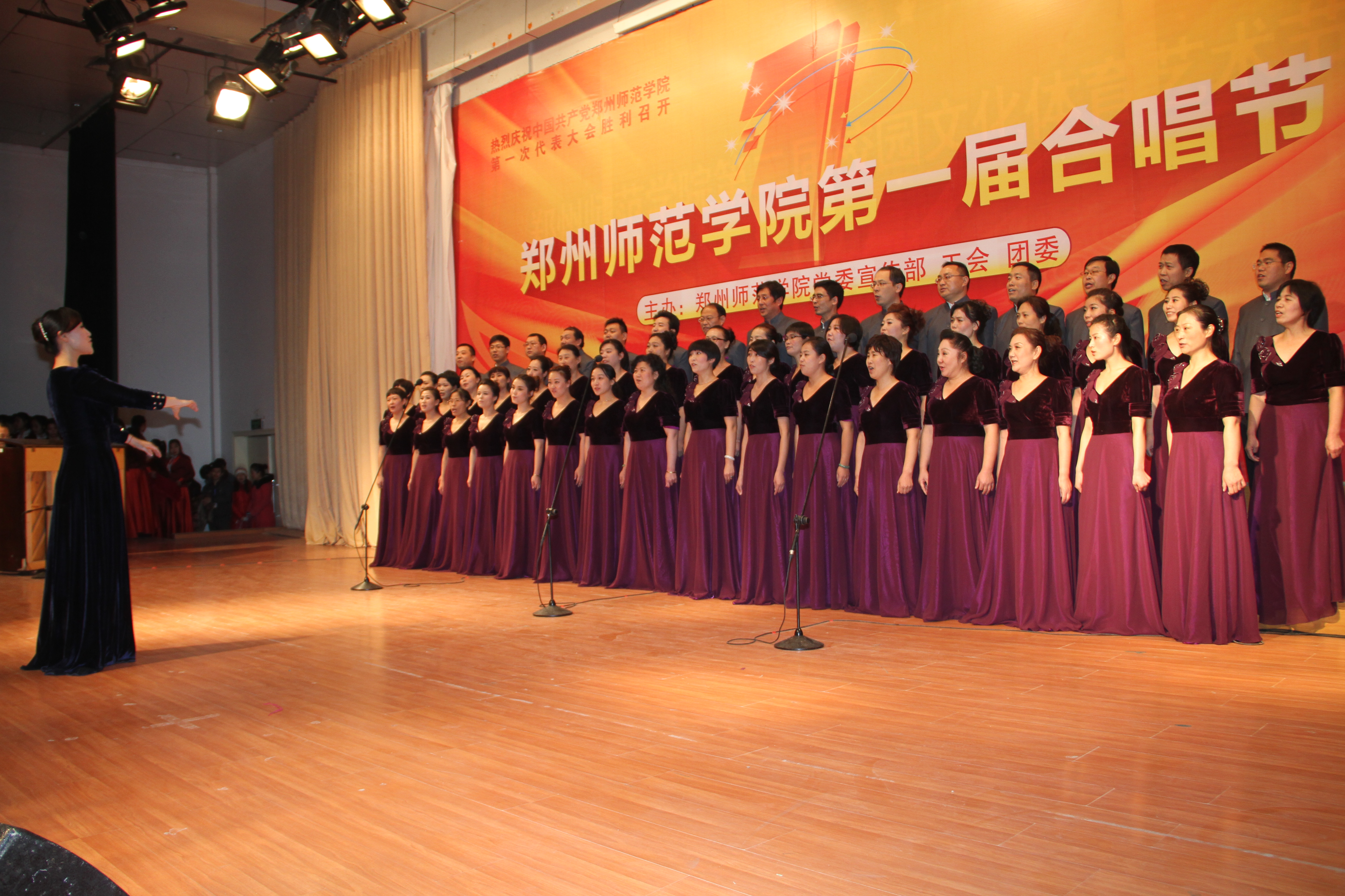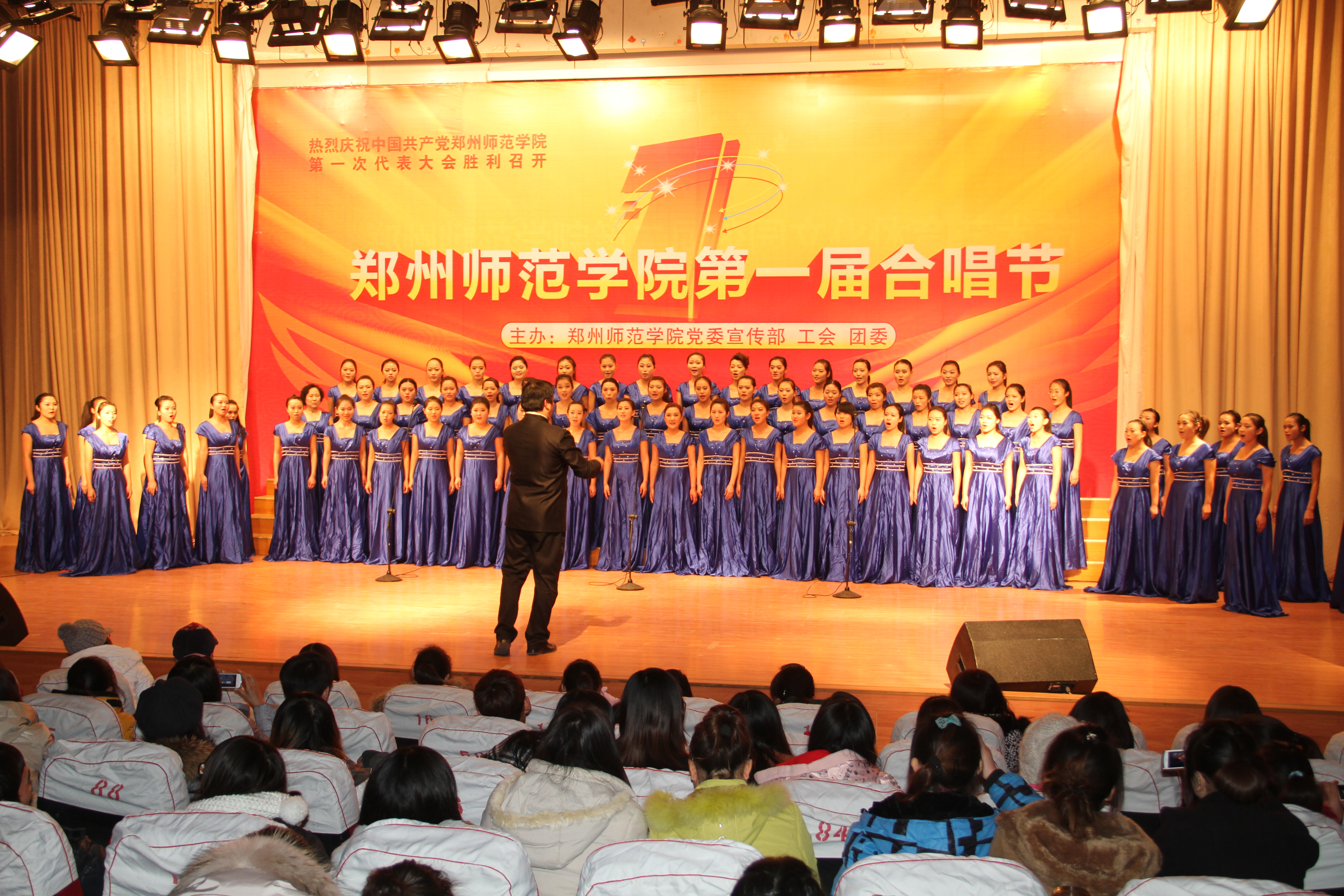 为热烈庆祝我校第一次党代会的胜利召开,12月19日晚,由我校党委宣传部、工会、团委主办的我校“第一届合唱节合唱比赛”决赛在七号楼学术报告厅隆重举行。校领导于向英、赵健、弓民、翟幸福、张进峰、王北生、蒋丽珠、张建航、孔青、贾敏仁、赵玉岭、崔东升、周静宇出席此次比赛。