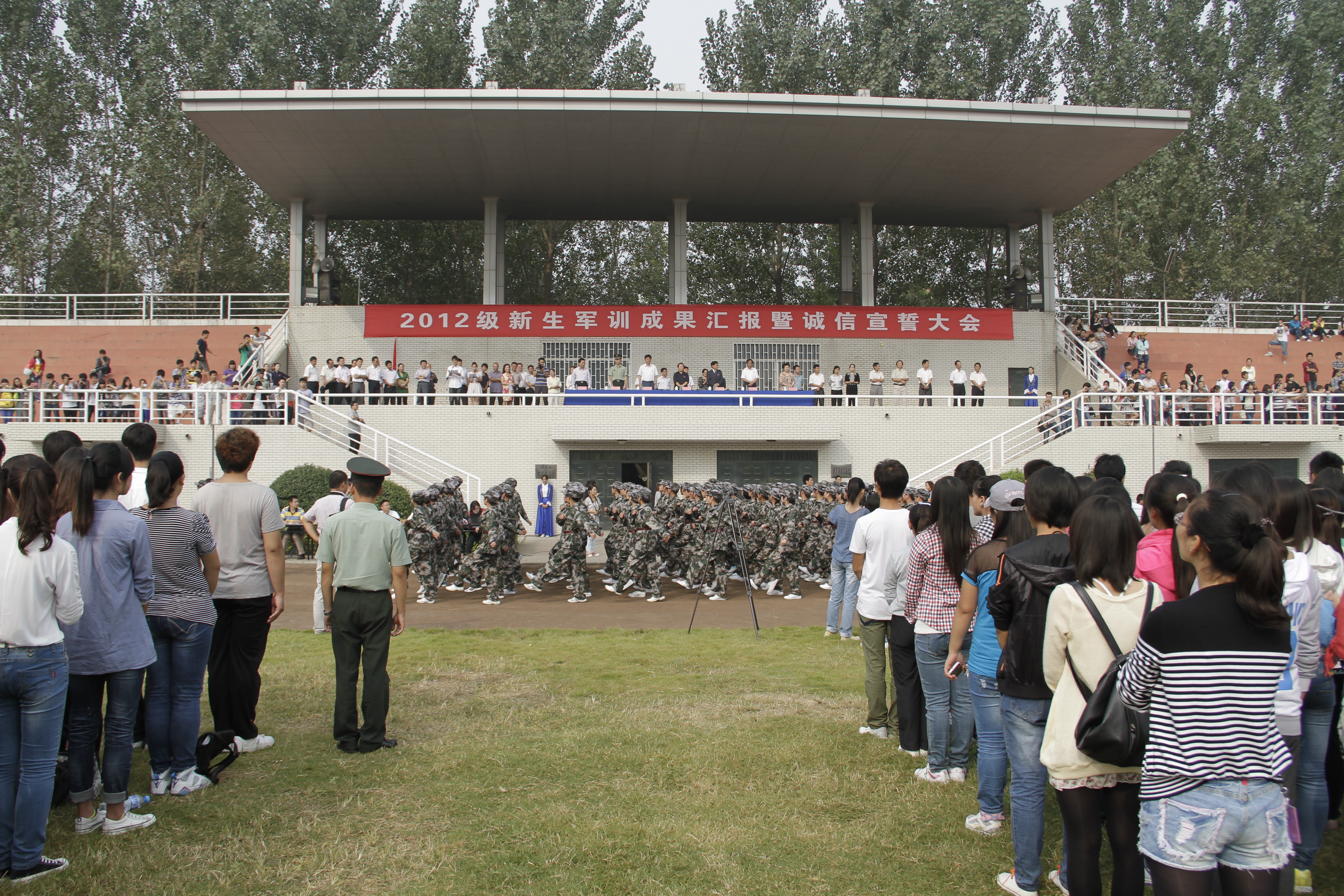 9月20日上午,我校在体育场举行2012级新生军训成果汇报暨诚信宣誓大会。全体校领导,各院系、处室负责人以及承训单位官兵出席大会。大会由党委副书记、工会主席弓民主持。