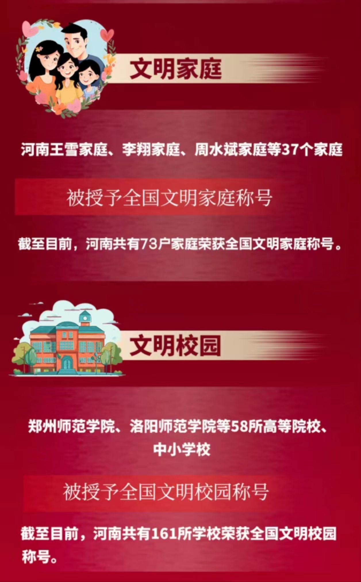 在表彰大会上,郑州师范学院等58所河南省高等院校、中小学校被命名表彰为第三届全国文明校园;王雪家庭等37户河南省家庭被命名表彰为第三届全国文明家庭,并作为河南省代表出席会议。