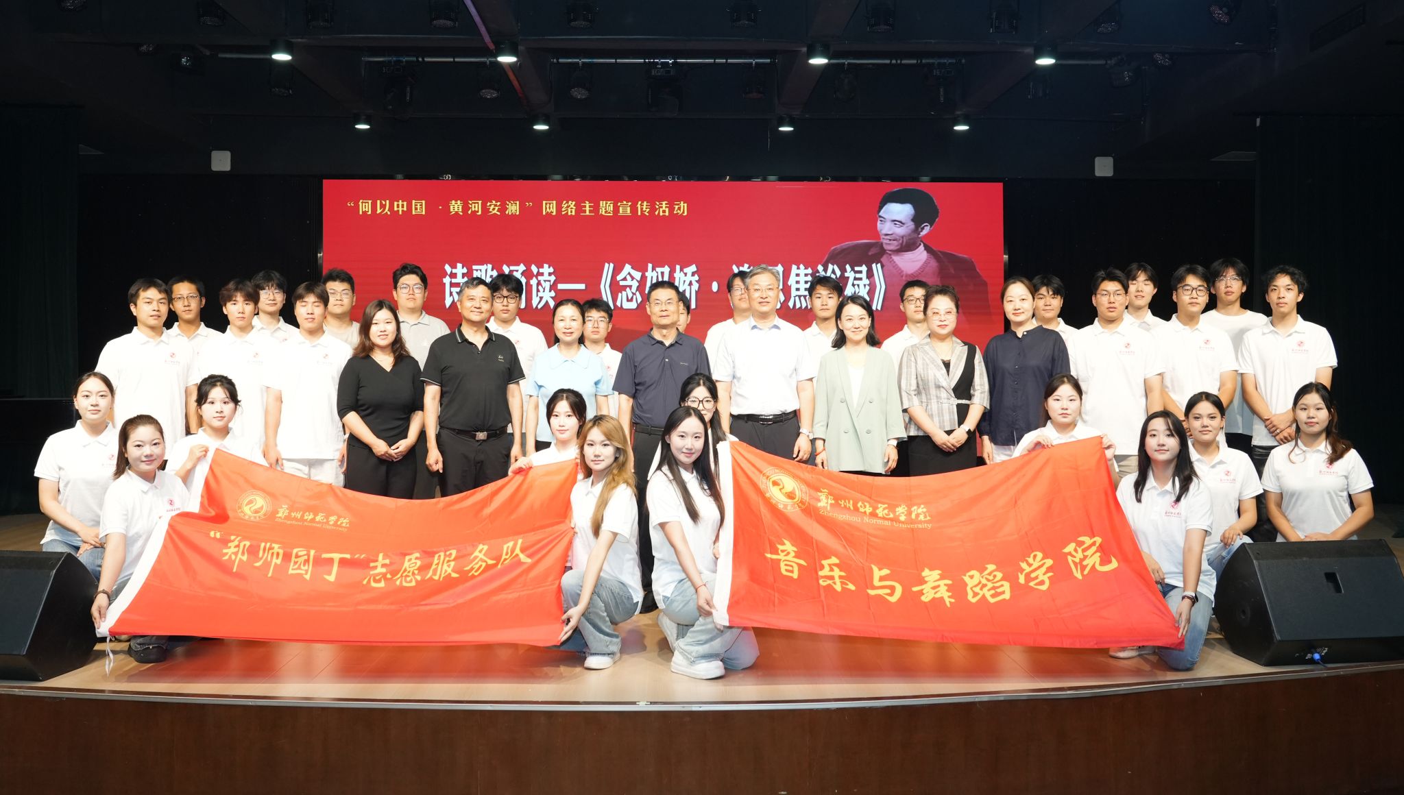 为高质量完成演出任务,学校高度重视、精心策划,由宣传部牵头、音乐与舞蹈学院承办,组建了由靳风林、刘迪两位老师主要负责的“郑师园丁”师生团队,共选拔32名同学参与排演。准备初期,邀请马克思主义学院教师为团队讲授“弘扬焦裕禄精神,传承黄河文化”主题思政课,结合《念奴娇·追思焦裕禄》的创作背景与精神内涵,深刻阐释焦裕禄同志全心全意为人民服务的崇高品质和黄河文化蕴含的民族精神,引导学生在艺术实践中坚定理想信念、增强文化自信。全体师生在连日高强度排练中不仅提升了专业水平,更经历了深刻的思想淬炼,真正做到“排演一场、感动一场、成长一场”。