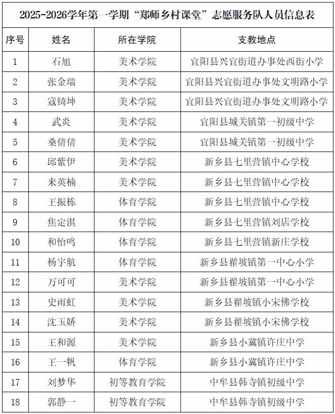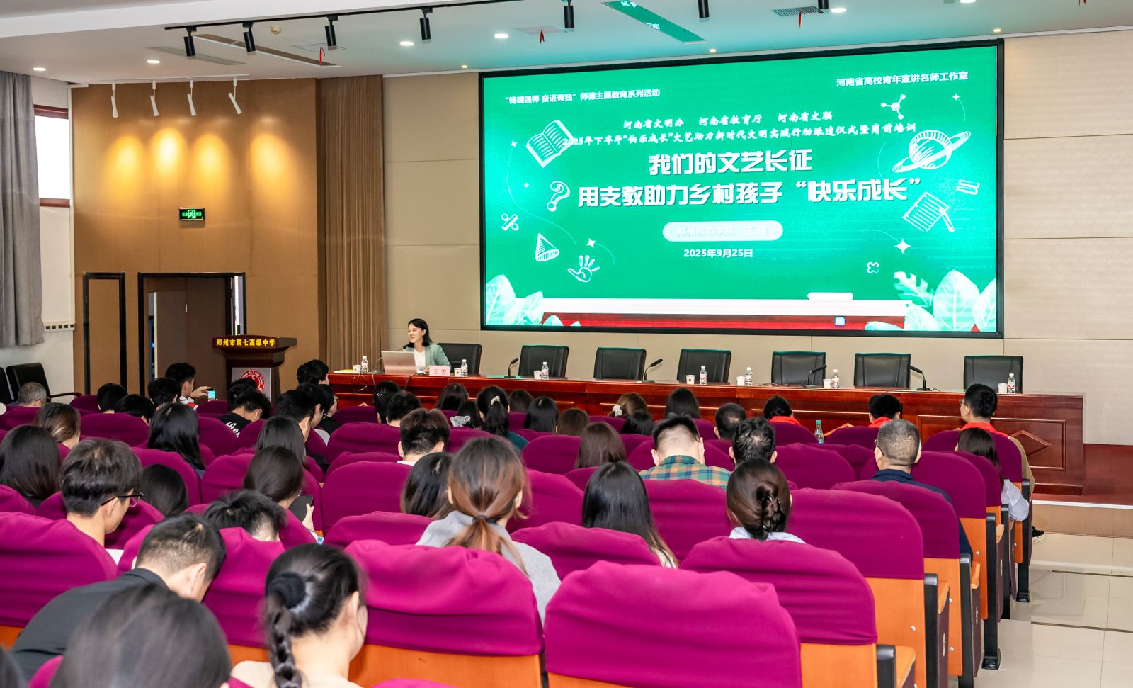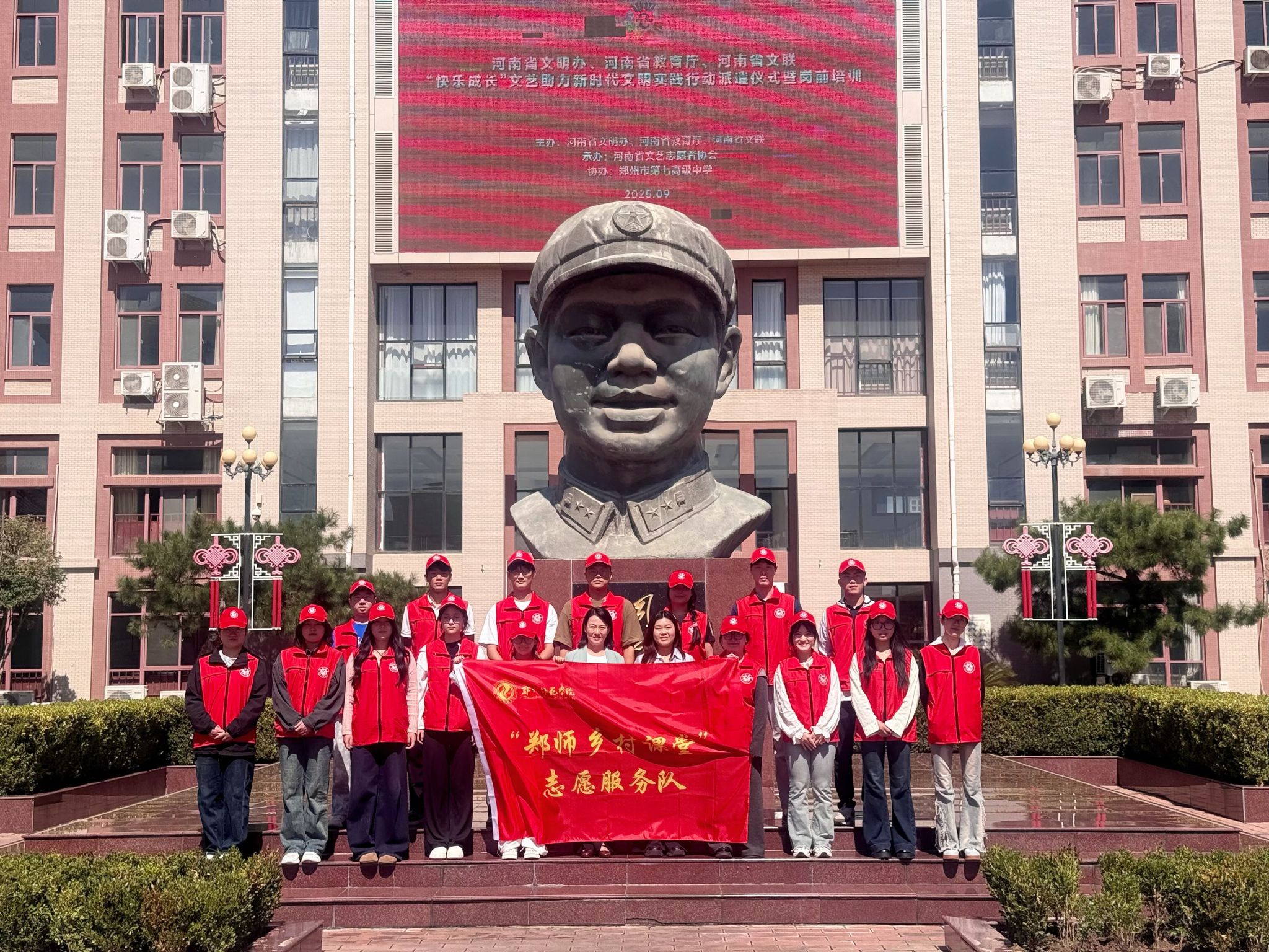 9月25日,由省文明办、省教育厅、省文联主办的2025年下半年“快乐成长”文艺助力新时代文明实践行动派遣仪式暨岗前培训在郑州七中举行。“郑师乡村课堂”志愿服务队中来自美术学院、体育学院、初等教育学院的18名优秀志愿者已分批次抵达中牟县、宜阳县、新乡县的10所乡村学校开展本学期的文艺支教,他们用智慧、知识、爱心丰富乡村学生的文化生活,以实际行动推动乡村学校的美育工作提质发展。我校党委宣传部相关负责同志带队参加本次活动。