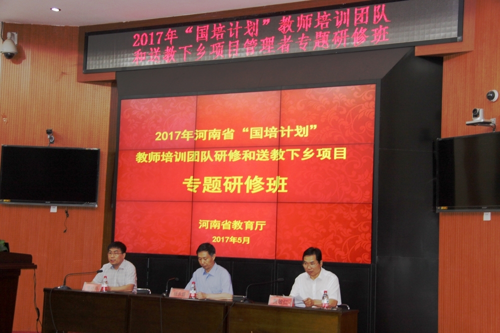 为进一步做好2017年“国培计划”教师培训团队研修和送教下乡项目实施工作,河南省教育厅于5月26日在我校举办2017年河南省“国培计划”教师培训团队研修和送教下乡项目管理者专题研修班。河南省教育厅“国培计划”项目执行办公室主任杨永盛、我校副校长贾敏仁出席开班仪式并讲话。开班仪式由省教育厅师范教育处李社亮主持。2017年新遴选A类项目县及拟承担教师培训团队研修和送教下乡任务的高等学校项目管理者80余人参加本次专题研究活动。