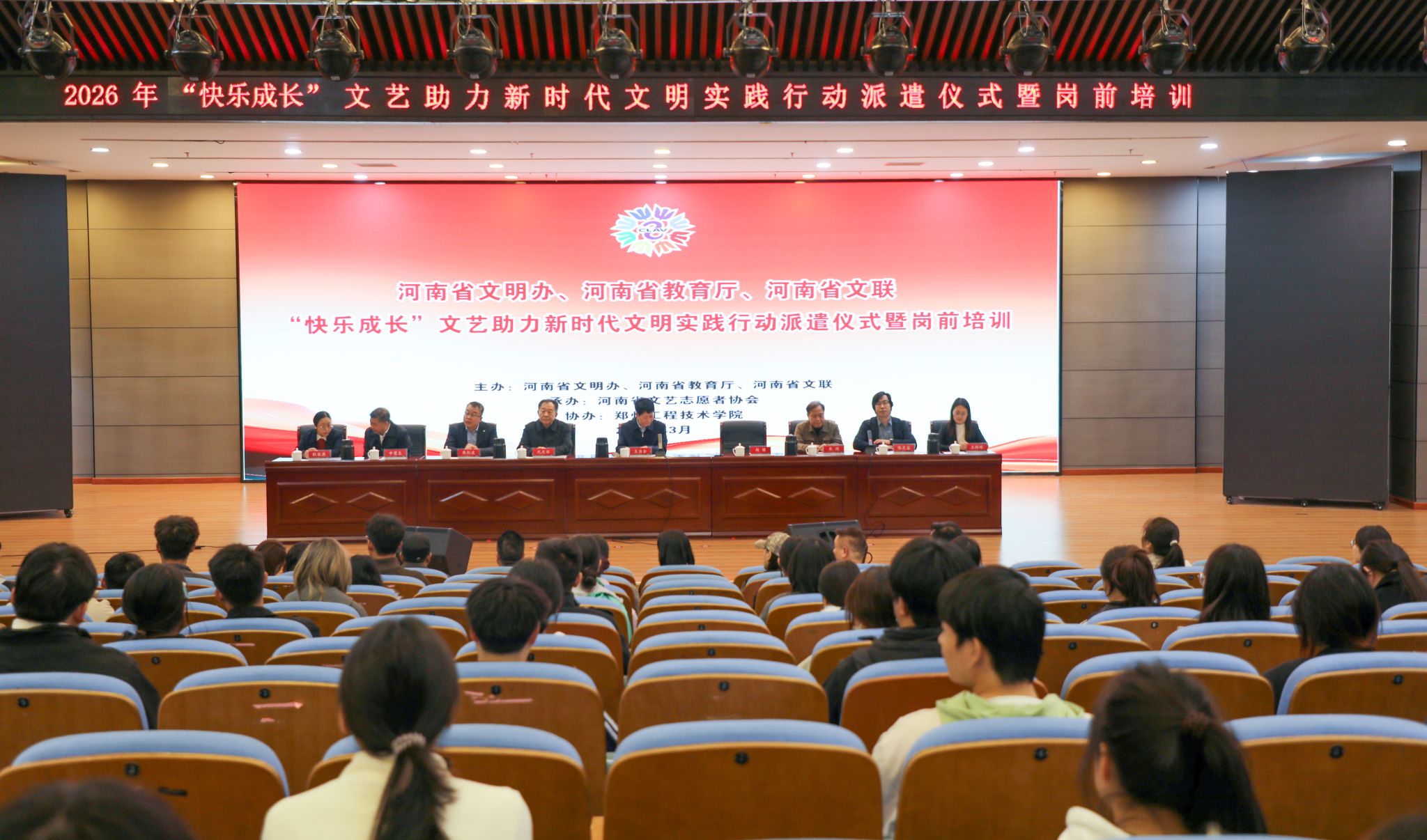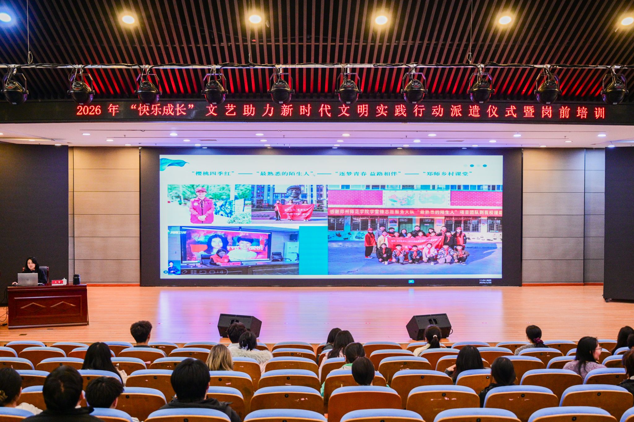 3月26日,由省文明办、省教育厅、省文联主办的2026年上半年“快乐成长”文艺助力新时代文明实践行动派遣仪式暨岗前培训在郑州工程技术学院举行。郑州师范学院“郑师乡村课堂”志愿服务队积极响应号召,选派来自数学与统计学院、音乐与舞蹈学院、美术学院、体育学院的18名学生,分赴安阳市、汝州市、洛阳市新安县、洛阳市偃师区、中牟县等地11所乡村学校开展本学期支教志愿服务,以青春力量助力乡村学生健康成长。