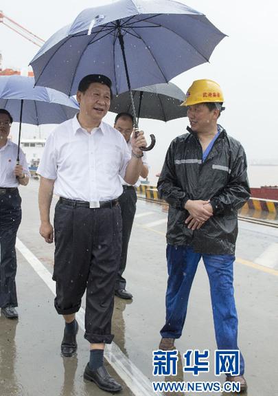 2013年7月21日上午,习近平冒雨来到武汉新港阳逻集装箱港区考察。 新华社记者 李学仁 摄