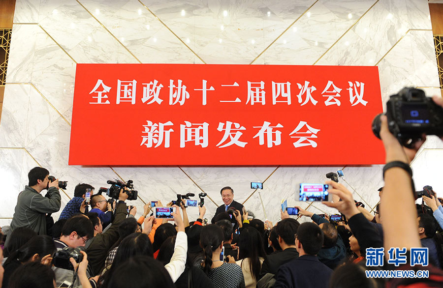 3月2日,全国政协十二届四次会议新闻发布会在北京人民大会堂举行,大会新闻发言人王国庆介绍会议有关情况并回答中外记者提问。